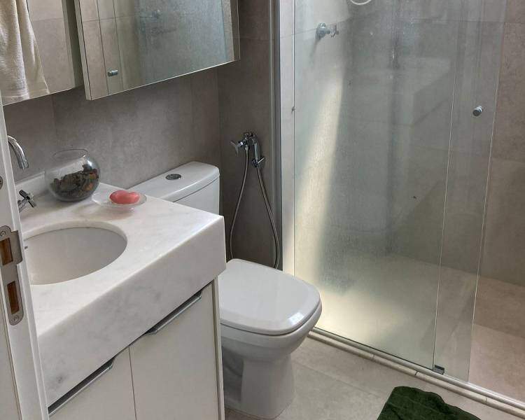 Banheiro social com bancada em granito, espelho, armários planejados e box em blindex