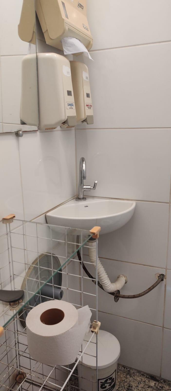 Com piso em granito, banheiro reformado cerâmica nova na cor branca.
